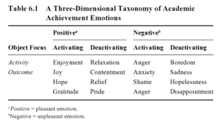În teorie, tipurile de emoții care au legătură cu procesul de învățare au fost clasificate în funcție de valența lor (pozitive și negative) și grupate pentru a arăta care sunt cele care activează spre acțiune și cele care ne determină să ne retragem din activitate.