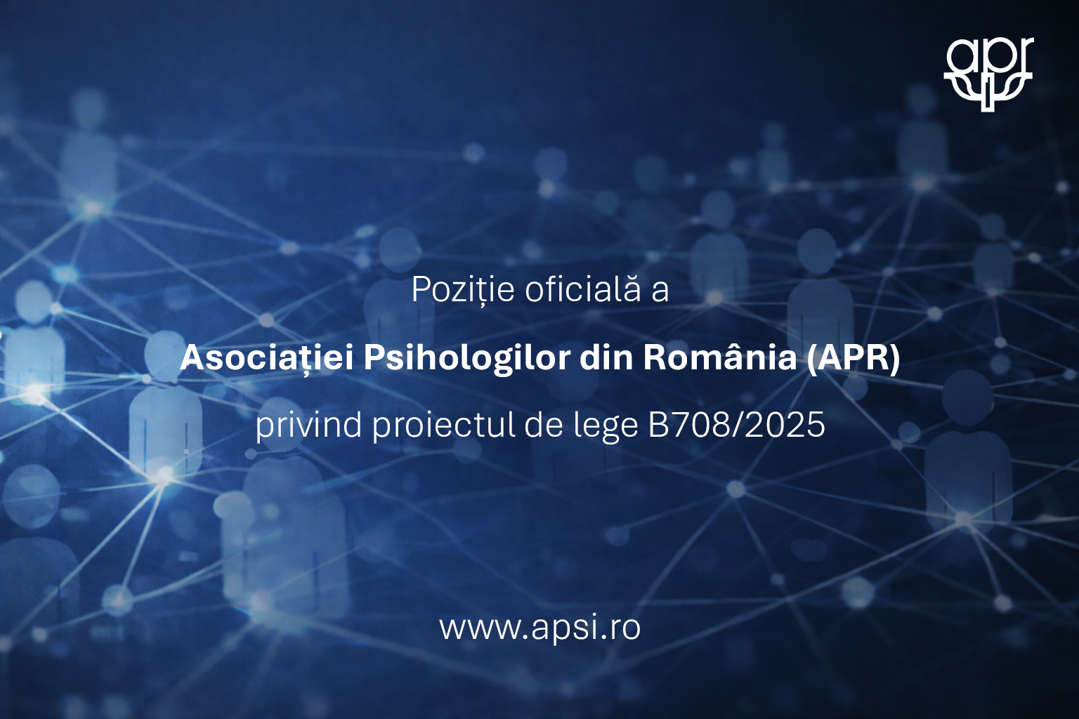 Asociația Psihologilor din România (APR), în urma consultării membrilor săi, își exprimă susținerea față de Proiectul de lege B708/2025, considerând că acesta răspunde unei nevoi structurale reale de reformă și modernizare a cadrului de reglementare a profesiei de psiholog în România.